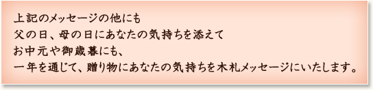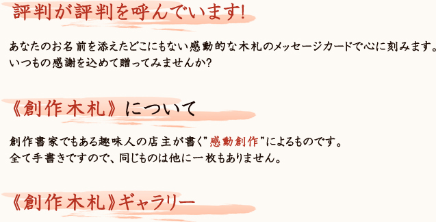1:名字と下のお名前 2:名字のみ 3:下のお名前のみ 4:氏名は不要 尚、お書きする株式会社は(株)、有限会社は(有)と省略させて頂きますのでご了承お願い申し上げます。 あなたのお名前を添えたどこにもない木札のメッセージカードをつけて化粧箱の中に入れてお届けいたします。 商品一覧 |